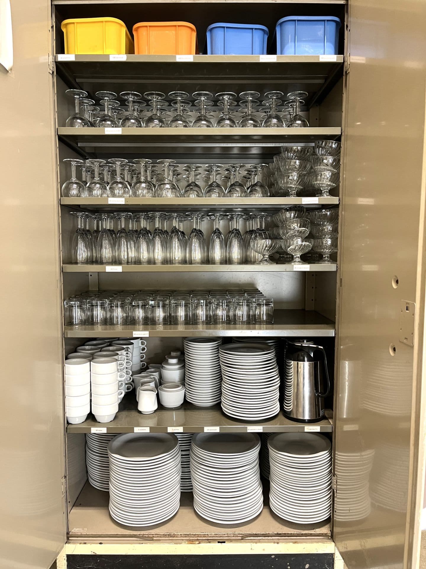 La salle est équipée de 3 vaisseliers de 50 couverts (photo) et d’un vaisselier de 25 couverts.